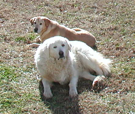 Our Boys: Noah (white) and Sundance (yellow) after a long hard day's work keeping the others in line.